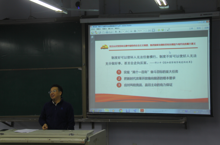 2019年12月2日晚,学校副校长李壮成教授在博文楼413教室,为美术学院2019级学生讲授题为“学习贯彻党的十九届四中全会精神”的形势与政策课,美术学院副教授杨刚、政治辅导员陈曦、2019级5,6,7,8,9,10班全体同学聆听本次授课。