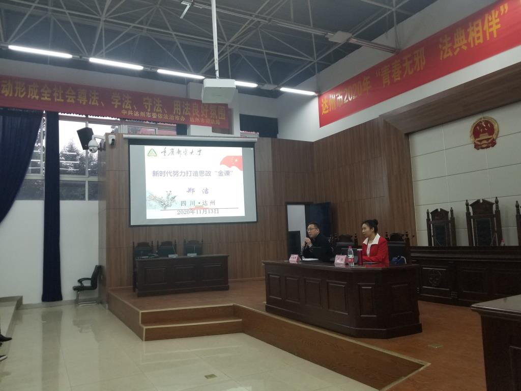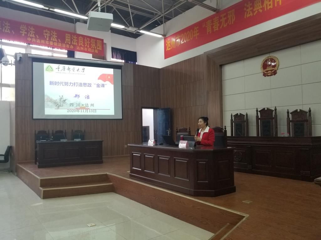 11月13日下午,应学院邀请,重庆邮电大学马克思主义学院副院长郑洁教授来到学院,在模拟法庭做了一场题为“新时代努力打造思政‘金课’”的专题讲座。讲座由院长刘长江教授主持,党总支书记刘春辉副教授出席并作总结。