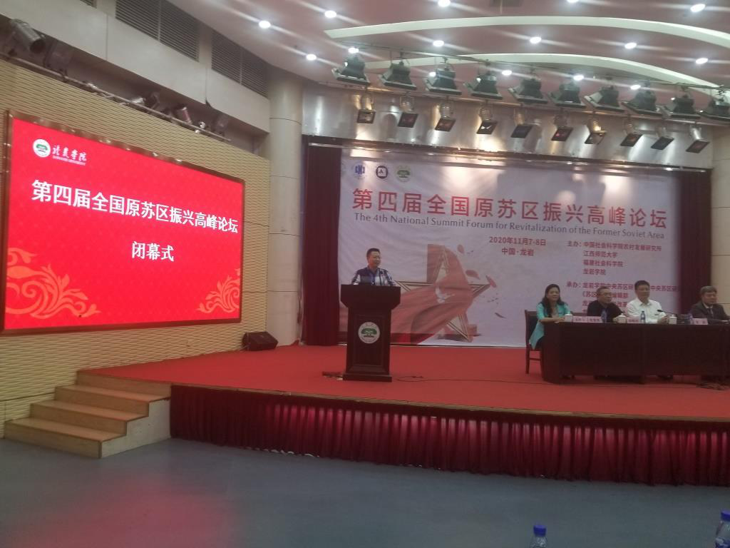 刘长江在闭幕式上作为“脱贫与发展”分论坛小组代表汇报分组研讨交流情况。刘长江指出:“本组专家学者围绕脱贫攻坚、产业发展、高质量发展、乡村振兴、生态文明建设、新型城镇化与城市群建设等六方面进行研讨,其中既有典型案例研究,也有深度理论分析,还有定性定量相结合的研究。大家一致认为,在完成脱贫攻坚任务后,革命老区发展要更重视相对贫困问题,突出产业兴旺、生态文明建设、新型城镇化与城市群协同发展,把乡村振兴与高质量发展结合起来,发挥苏区精神的强大精神动力。同时表示在研究过程中要出更多、更优、更有针对性的决策咨询成果,为革命老区全面建设社会主义现代化贡献智慧。”