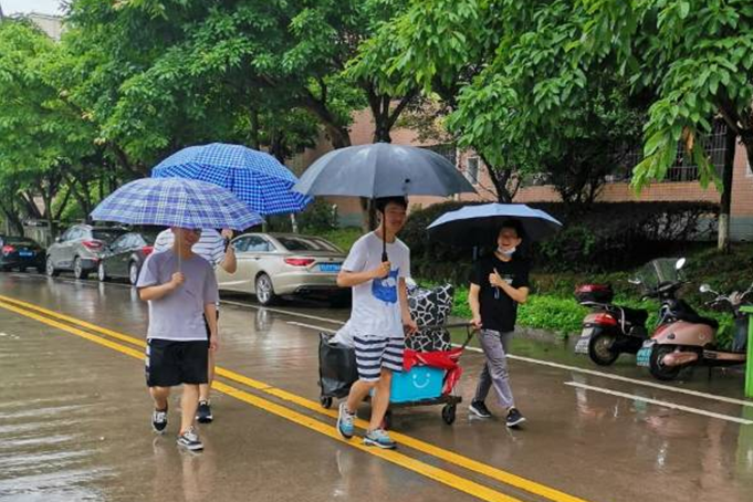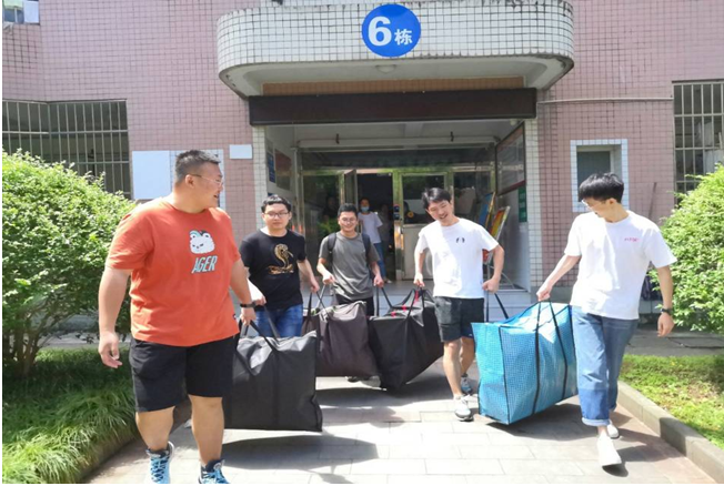 在离校期间,师生志愿者帮助毕业生打包、搬运行李,帮助学生离校。志愿者们团结协作不辞劳苦顶着烈日冒着大雨,把行李等物品有序地放在拖车上,在寝室与快递站之间往返。