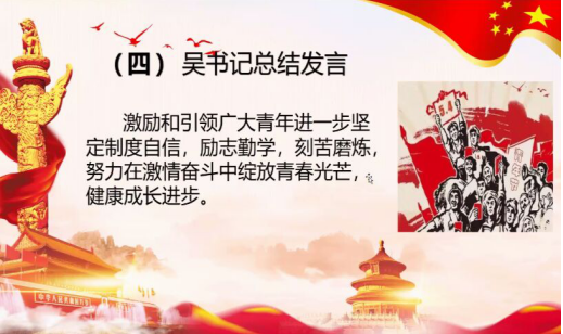 通过此次主题团日活动,激励和引领广大青年进一步坚定制度自信,励志勤学,刻苦磨炼,成长成才,努力在激情奋斗中绽放青春光