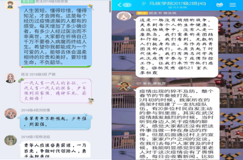 “战疫”志愿者代表分享了他们的“战疫”故事和学习心得。2017级2班的杨茂君讲述了自己的故事并说到:“在疫情暴发时,自己产生了投身于抗疫志愿队的想法并付诸行动。我特别庆幸,我是中国人,我为生在中国而骄傲和自豪!”2017级2班的廖祖霞谈到自己的感受:“强健体魄,战胜一切艰难险阻,做一个肩有大任的新时代青年,为社会贡献自己的力量。”2018级1班的廖洁说:“面对此次疫情大考开始时会觉得很无助,但是通过深入群众服务,让我感受到了作为青年的我们与全国人民一起战斗,终将迎来胜利。”2018级4班的伍家根说到:“作为当代青年大学生,在新冠肺炎的严峻挑战下,应该有挺身而出的觉悟,肩负起时代的使命,团结努力抗击疫情。”