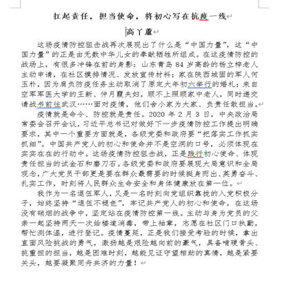 学院学生会主席蔡润禾同学说,在这次战役行动中,我们党和国家始终把人民的生命安全和身体健康放在第一位,不惜组织巨大的人力、物力和财力与疫情战斗,我深深感受到党和国家的伟大,党和国家是人民的坚强依靠和保障,我为有幸生活在这样一个伟大的国家而自豪。