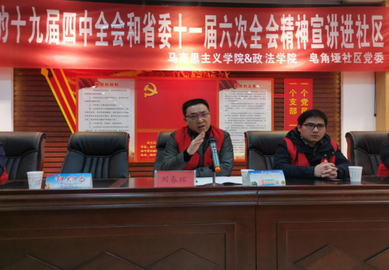 为学习宣传贯彻党的十九届四中全会和省委十一届六次全会精神,12月31日下午,马克思主义学院、taptap点点体育党总支书记刘春辉在通川区朝阳街道皂角垭社区宣讲党的十九届四中全会和省委十一届六次全会精神,社区党委书记邱文成主持宣讲会,部分教师以及20余名学生志愿者参加了此次活动。