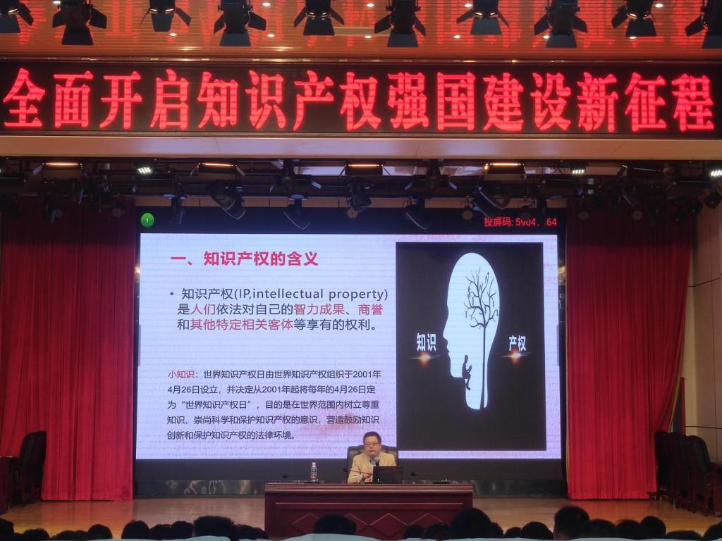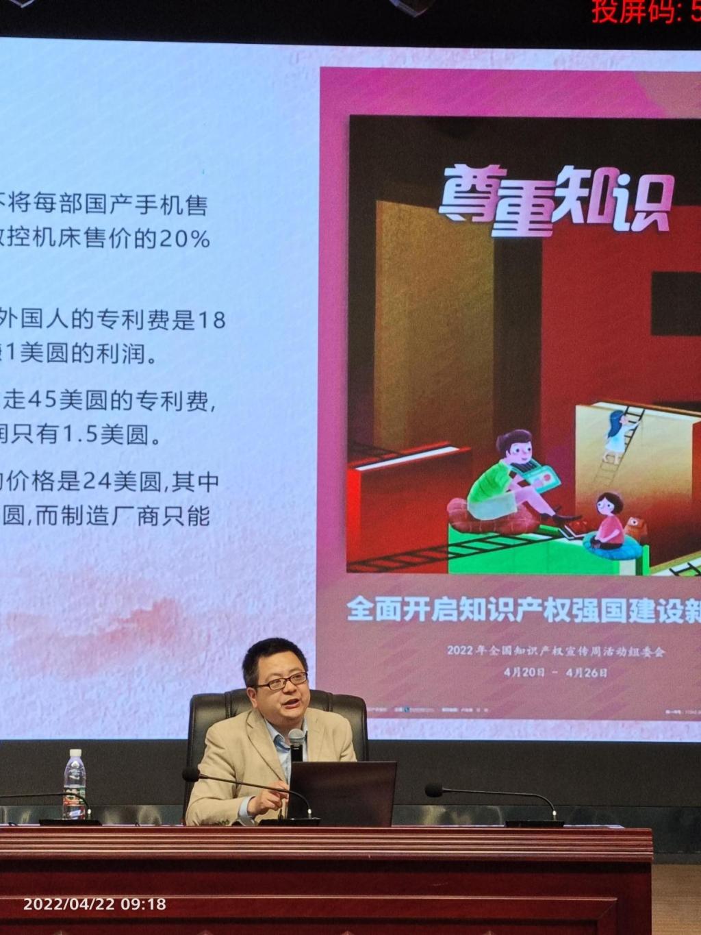 谢老师以国家知识产权总局拍摄的知识产权公益广告为序开始其讲座,首先介绍了何为知识产权,结合2022年北京冬奥会吉祥物冰墩墩向学生们进行分析讲解。接着谢老师以我国企业销售手机需向国外专利持有者支付专利使用费等详实的数据引出保护知识产权对国家、对企业、对个人的意义。最后谢老师结合漫画苏东坡维权为例,给在场师生分析介绍了生活中常见的著作权、商标权、专利权、商业秘密等知识产权。