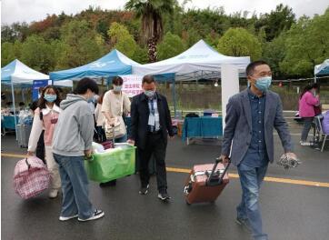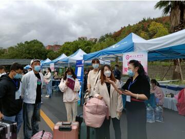 接待现场,由学院党政领导、任课教师、辅导员老师和学生志愿者组成的志愿服务队在迎新接待现场开展简洁快速的“一站式”志愿服务。南客站志愿服务师生在车站查验新生健康码、行程卡、24小时核酸检测阴性证明报告,引导学生乘坐接待车辆到学校报到。校园内志愿者引导学生验证身份、扫码报到,为同学们发放校园卡、安排寝室,办理入住手续、帮助他们运送行李等。