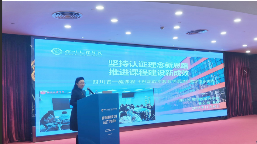 大会的案例分享环节,曹红梅教授做了交流分享。曹老师从四川省一流课程《思想政治教育学原理》教学改革实践出发,以《坚持认证理念新思路 推进课程建设新成效》为主题,分享了“根据‘学生中心’进行教学‘痛点’问题梳理,以师范类专业毕业要求为导向(即‘产出导向’)提出‘痛点’解决方案,从而在‘持续改进’中推动课程建设取得新成效”的经验。