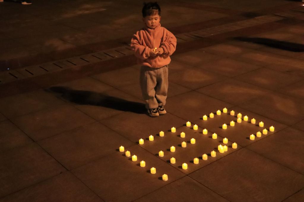13日晚上8时,在音演广场的南京大屠杀公祭日主题活动展板前摆放了呈“12.13”“南京!”等字样的电子蜡烛,学校的学生自愿前来参与,在电子蜡烛帮拍照留念,驻足默哀。也有学生有感而发演唱爱国歌曲、发表演讲等等。