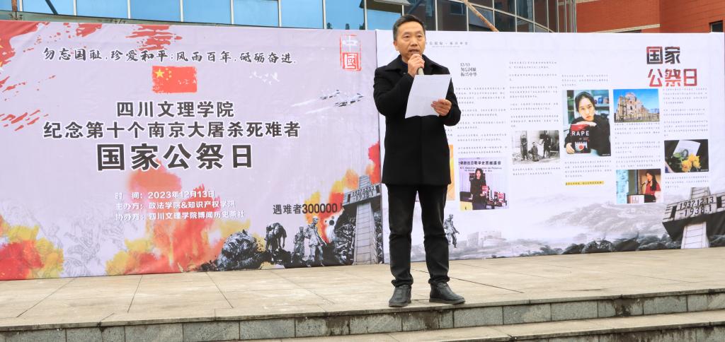 12月13日,博闻历史茶社在音演广场组织开展了南京大屠杀死难者国家公祭日主题活动。此次活动是由学院主办、博闻历史茶社承办。学院党委书记岳臣忠、学工办主任唐幸福、历史学教研组主任王盟等到场参加活动。