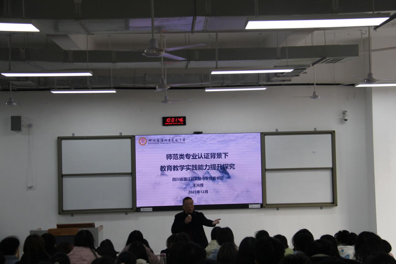 12月27日上午,四川省通江县实验中学党委书记王兴周在东A318进行“师范认证生教育教学能力提升研究”专题讲座,院长刘长江教授主持,taptap2021级1班、2023级1班和3班全体学生到场聆听。