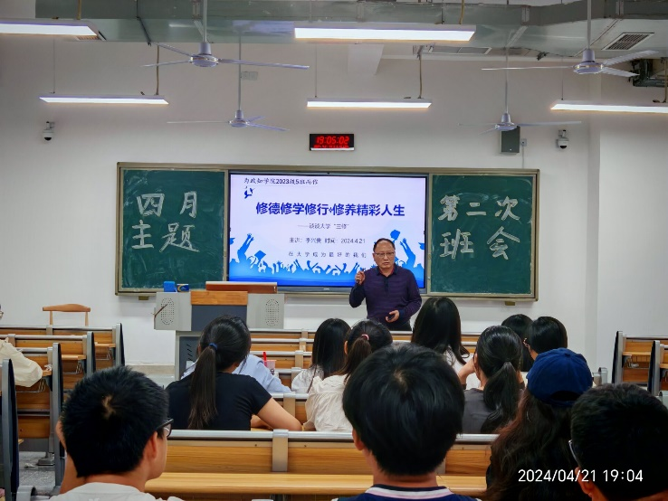 为深入落实学校《领导干部联系教学班实施方案(试行)》精神,学院邀请校图书馆党总支书记李兴贵老师于2024年4月21日晚为行政管理专业2023级5班作题为《修德修学修行,修养精彩人生》的主旨讲座。