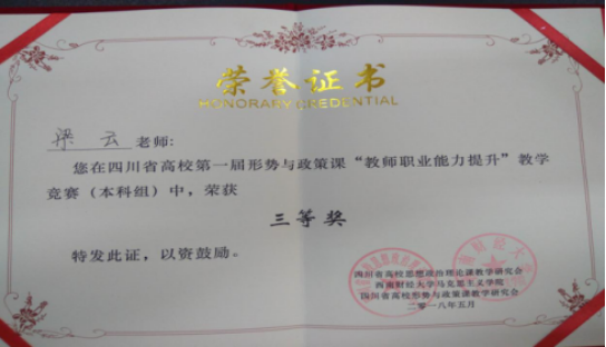 在刚刚结束的四川省首届高校形势与政策课“教师职业能力提升”教学竞赛中,taptap梁云老师取得优异成绩,斩获四川省三等奖。本次教学竞赛由四川省高校思想政治理论课教学研究会主办、西南财经大学马克思主义学院承办、四川省高校形势与政策课教学研究会协办,系我省首次针对高校形势与政策课所展开的竞赛活动。