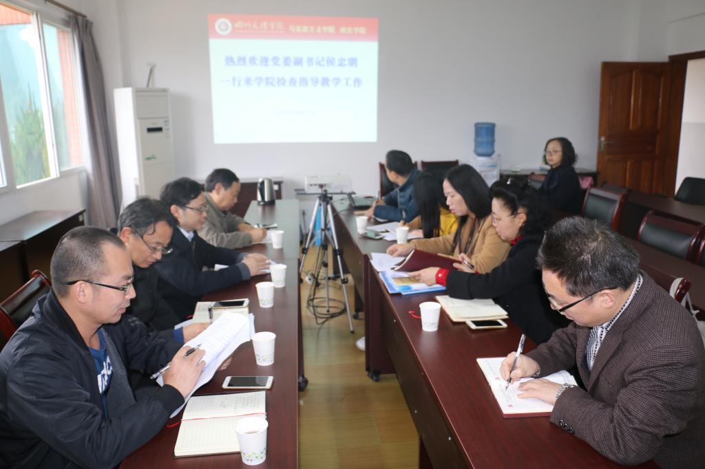 侯书记一行在考察了学院办公情况和档案、资料管理情况后,与taptap部分党政领导、教研室主任及办公室工作人员一起在611会议室进行了交流。首先,朱德莉副院长代表学院从重点建设内容、教学运行基本情况和发展方向三个方面进行了工作汇报。刘春辉书记对学院党风、教风、学风建设方面的成效和问题做了汇报,并提出希望规范、提高教研室主任待遇等问题。曾宪文副处长对taptap师生反应的硬件设施老旧问题给予答复,之后肯定了taptap在专业评估、建设、管理上的成绩,并提出希望两院在质量工程项目、专业发展、实践基地建设、优势学科建设等方面继续努力,挖掘亮点,做出特色。陈正平教授肯定了taptap教学与教学服务管理方面工作,但也指出公共课的教学问题依然存在,教研活动也有待进一步规范化。最后,侯忠明书记充分肯定了taptap地位的特殊性和重要性,并对两院寄予了极大的期待,提出两院要在五个方面做好示范作用:一、做鲜明旗帜的示范;二、做教学改革的示范;三、做学科融合的示范;四、做依法治教的示范;五、做素质教育的示范。