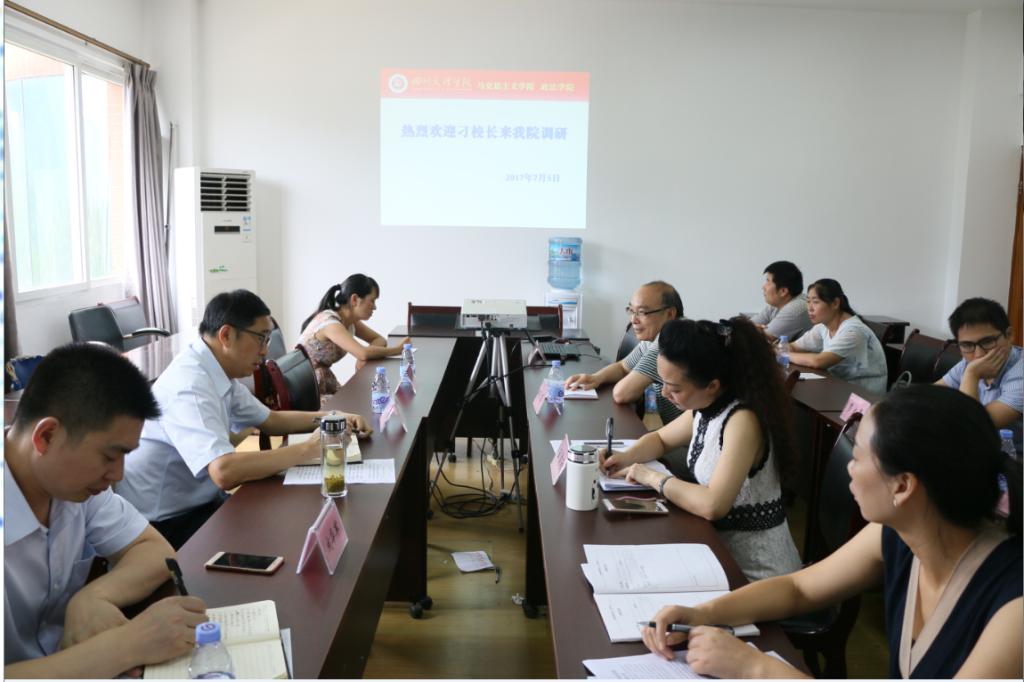 院长王秀珍代表学院党政热烈欢迎刁校长一行来学院调研,她从学院基本概况、师资队伍建设、学科建设、专业规划、教研室师资整合、教学团队打造、科研平台打造、服务社会、学生工作等方面取得的成绩、面临的问题、下一步工作思路作了全面而细致的汇报。党总支书记陈岗就学院党建工作、科研工作等作了汇报。副院长朱德莉对学院教学工作、继续教育工作、教师社会实践等作了汇报。教师代表汤海生、罗其芳、杨宏等围绕学院发展、思政课教学质量年建设、日常教学管理、教师待遇等作了汇报交流。