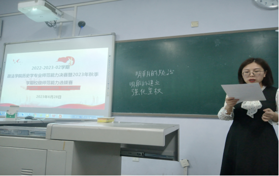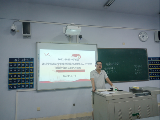 6月28日晚,历史学专业教研室于博文楼519教室举行2022-2023-02学期历史学专业教学能力大赛决赛暨2023年taptap点点体育师范生教学能力大赛选拔赛,何先成、张涛、王盟、李媛媛及铭仁园学校初中历史备课组组长秦红五位教师担任此次大赛的评委。
