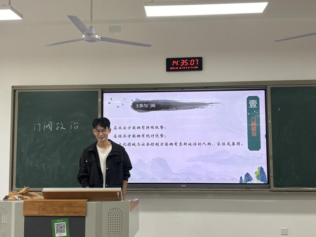 陶锐老师此次试讲的题目为《东晋门阀政治》,在有限的时间内,展现出了较强的教学基本功,在灵活运用现代教育技术和教具方面的能力也较为突出,取得了不错的教学效果。