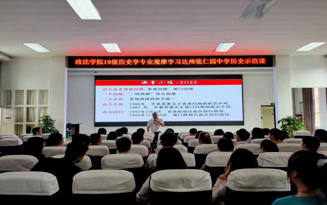 达州市初中历史中心学科组成员、铭仁园中学初中历史备课组组长、青年骨干教师秦红为大家带来了一场精彩的历史课程示范课。此次示范课的教学内容为《紫荆花开、白莲绽放——香港》。秦红老师通过精心的教学设计、精巧的设问、幽默风趣的教学互动、新颖完备的教学环节将铭仁园中学的“三学三问”特色教学法,向在场的师生做了一个全方位的生动展示。整个教学活动既严肃又活泼,充分体现了以学生为主体、教师为引导的教学理念,通过不断的设问和引导,层层递进,充分调动和激发了中学生的学习兴趣,从而实现知识习得和素质提升的有效融合,并深刻践行了新时代所赋予历史课程铸魂育人、培根铸魂的根本任务。