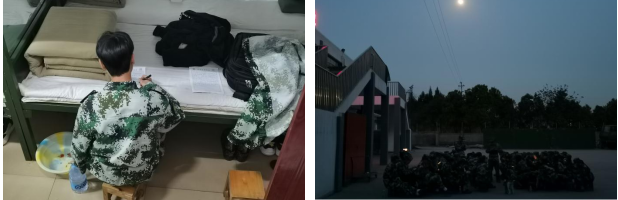 对于军训,同学们充满热情,满怀期待。在到达目的地之后,在教官的带领下,同学们领取了自己的训练服装等物品。摆放好自己的日常生活用品之后,跟随教官学习了叠被,虽然当时头顶骄阳,但是每个同学都专心致志,努力将被子一步一步叠成“豆腐块”。之后,同学们也迎来了军训的第一餐,或许是环境的改变,同学们还没有习惯,但是他们没有丝毫抱怨,在用餐结束后,主动打扫了餐桌。同时,同学们也纷纷上交了自己的手机,便于专心致志的训练。