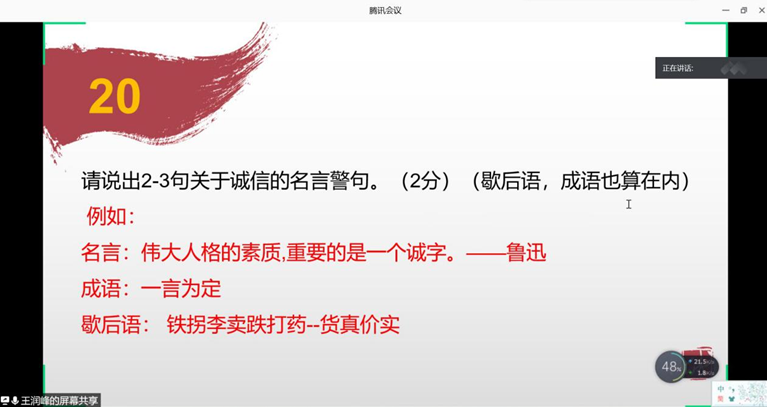 6月27日19:00时,为传承和弘扬中华民族诚实守信的传统美德,提高同学们的诚信素养,积极践行社会主义核心价值观,taptap在腾讯会议上成功开展了诚信知识竞赛。此次竞赛邀请了学院团总支副书记彭森林、团总支常务第二副书记、学生会主席汪洁、团总支第三副书记李梅、学生会副主席杨淇童担任竞赛评委并参与小组分数统计。2018级、2019级共22支队伍参加竞赛。