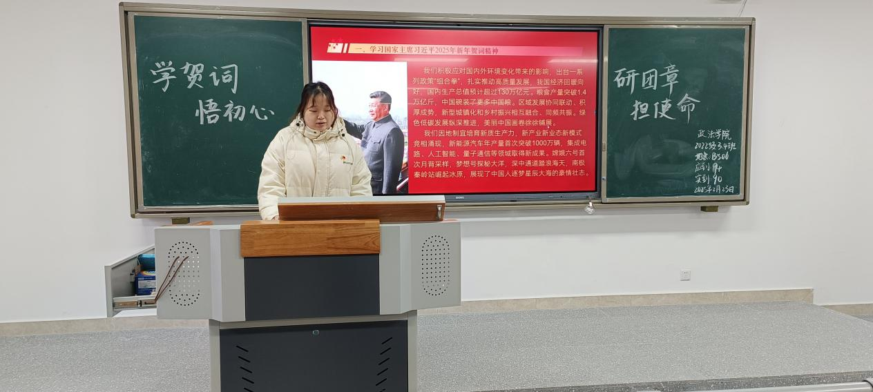 团会伊始,各班团支书精心播放国家主席习近平2025年新年贺词音频或视频,全体团员青年安静而专注地共同聆听习近平总书记殷殷的时代嘱托与期望。随后,团支书带领大家解读新年贺词,结合当下社会热点事件,如科技创新领域的突破、乡村振兴中的青年身影,以及青年在就业创业、志愿服务等方面的发展实际案例,生动地分享感悟鼓励各团员青年深入思考贺词对自身成长的深刻启示。