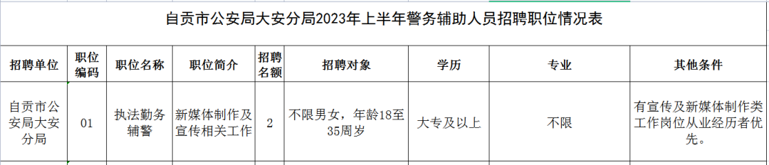 公安机关警务辅助人员22名, 各岗位报名条件见《自贡市公安局大安分局2023年上半年警务辅助人员招聘职位情况表》。