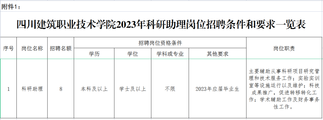 附件【附件1:四川建筑职业技术学院2023年科研助理岗位招聘条件和要求一览表.xls】