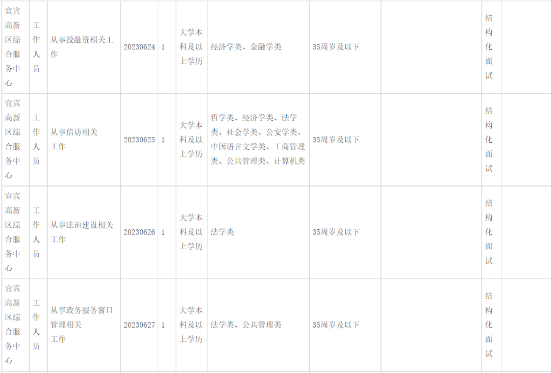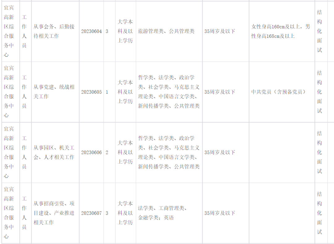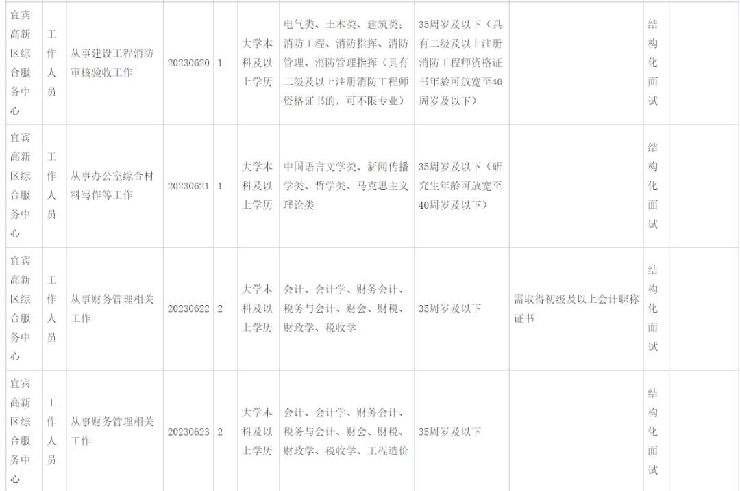 招聘聘用人员37名,岗位具体情况详见本公告附件1《宜宾高新区综合服务中心2023年公开招聘聘用人员岗位表》。