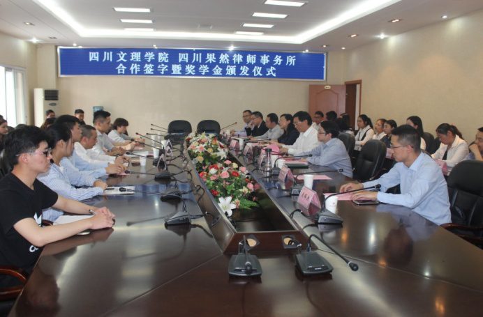 签字仪式之前,侯忠明副书记首先代表学校致辞并介绍学校情况,他介绍了学校的办学历史与现状、学校的办学思路、人才培养目标和培养模式,指出果然律师事务所的优势,希望双方共建共享,合作共赢。田金陇主任代表四川果然律师事务所讲话,他指出,文理学院的办事高效给他留下深刻印象,法律实践对培养法律人才具有重要意义。他结合设立“果然奖学金”的目的和四川果然律师事务所的理念向同学们提出三点希望:学会善意;学会沉心;学会坚持。