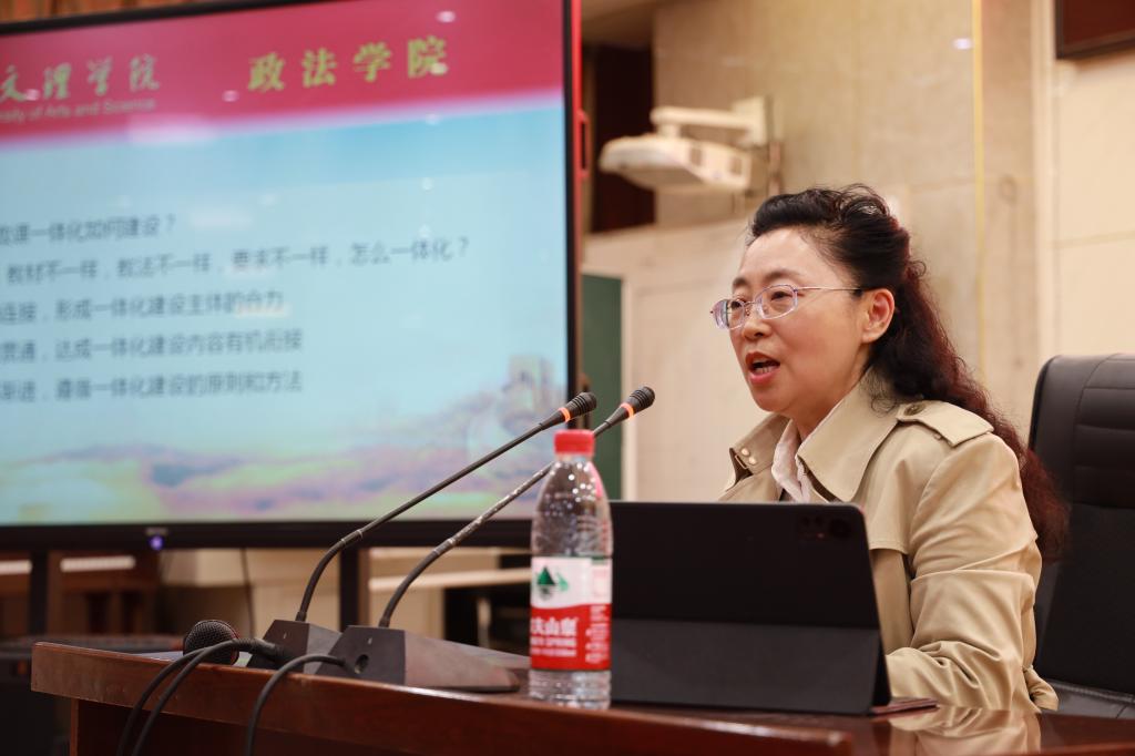 曹红梅教授为参会的全体思政课老师做了题为《一体化视域下大中小学思政课的教学目标和方法》的讲座。曹教授从大中小学思政课一体化的相关问题、大中小不同学段同一主题的教学反思、一体化视域下大中小学思政课的教学目标设定和方法选择等方面进行了阐释。她指出,“大中小学思政课一体化建设”就是按照立德树人的根本任务,把小学、初中、高中、大学思政课四个独立运作但又相互联系的学段根据横向贯通、纵向衔接的原则,统筹设计安排各学段思政课的教学要素,从而形成一个有机的大中小学思政课共同体,充分发挥出协同育人的最大效用;一体化视域下大中小学思政课的教学目标设定必须以教育部的相关文件和课程标准为依据,根据不同主题的内容要求和学生身心发展特点选择议题式、参与式、项目式等教学模式和方法,才能发挥思政课铸魂育人的功效。
