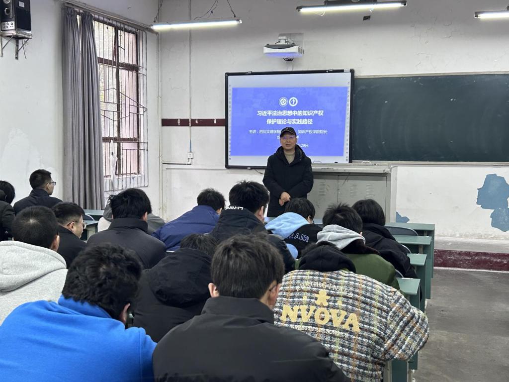 (刘长江为2023级数字媒体技术专业学生作《习近平法治思想中的知识产权保护理论和实践路径》专题讲座)